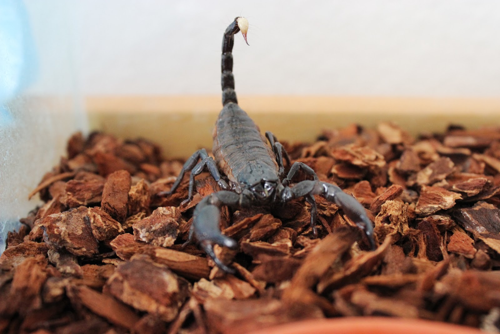 Разводить скорпионов я не могу, тк это очень ответственное дело и требует много свободного времени. В принципе, скорпион самодостаточен. Он может неделями не выходить из домика. По крайней мере чтобы это было как-то заметно. Его рацион довольно скуден - только живые сверчки и очень редко - вода. Василий II - азиатский лесной скорпион, поэтому ему необходима влага как на его родине, пардон, в Тропиках. Распыляю воду в террариуме 1-2 раза в день и подогреваю лампой. Лампу Василий не любит, от света прячется в скорлупку. Пишут, что продолжительность жизни такого скорпиона в неволе - около 10 лет.