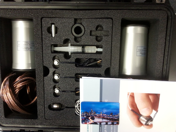 Сам шейкер снизу, над ним - 3 forecups - маленькая цилиндрическая фигушечка с медной спиралью, которая приклеивается к тестируему объекту торцом, а шейкер на нее одевается. Большие цилиндры - предохранители.