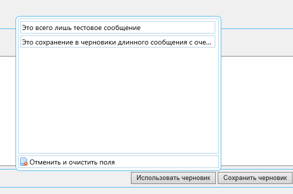 Можно выбрать сохраненное сообщение - или отменить и очистить поля. После запроса производится соответствующая операция. Запрос нужен еще и потому, что в специальном поле сохраняется номер черновика и после размещения поста черновик удаляется, чтобы не плодить сущностей. Т.е. если загрузить черновик, а потом написать нечто совсем другое, не очищая, то черновик будет все равно удален. А если нажать на "Отменить и очистить поля" - можно писать все что угодно, соотв. значение будет нулевым и черновик останется в целости и сохранности.